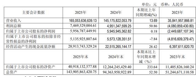 利润更险些没动,2025年归母净利润59.57亿元,同比增幅仅0.18%,2024年这个数字是342.72%;另外扣非净利润致使还下滑了7.84%。