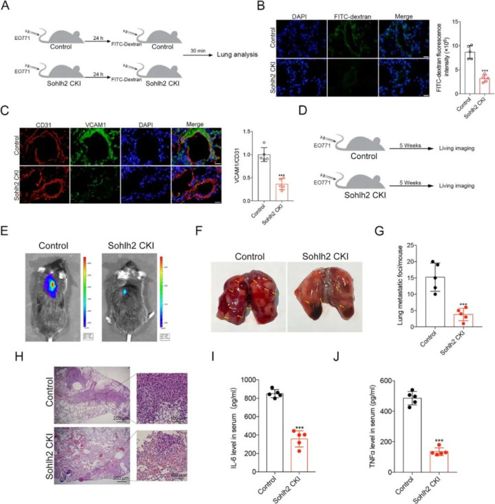 为了进一步评估血管内皮细胞中 Sohlh2 对体内肺血管内皮通透性的影响,开云体育官网筹商东说念主员在打针 EO771 细胞 24 小时后,向尾静脉打针了 FITC-葡聚糖。30 分钟后,固定肺组织以备后续切片染色。分析了 FITC 的荧光强度,并对肺血管中的 VCAM1 进行了免疫荧光染色。与对照组比较,Sohlh2 CKI 组中 FITC 和 VCAM1 的荧光强度削弱。为了进一步瓦解血管内皮细胞中 Sohlh2 对体内三阴性乳腺癌(TNBC)肺变调的影响,通过向 Sohlh2 CKI 小鼠打针 EO771-荧光素酶细胞配置了 TNBC 肺变调模子。活体成像和 HE 染色败露,与对照组小鼠比较,Sohlh2 CKI 小鼠中血管内皮细胞 Sohlh2 过抒发扼制了 TNBC 肺变调。酶联免疫吸附测定(ELISA)畛域败露,Sohlh2 裁汰了血清中炎症细胞因子 TNFα 和 IL-6 的水平。上述畛域有劲地标明,血管内皮细胞中 Sohlh2 过抒发扼制了 TNBC 肺变调。