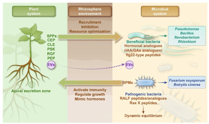 在植物-微生物互作中,TKPs构建起根际双向信号会聚。植物通过根系分泌物或细胞外囊泡开释CEP、CLE等肽,招募根瘤菌、芽孢杆菌等有意菌,遏止尖孢镰刀菌等病原菌定殖,同期优化根系构型。微生物则分泌RaxX、F-RALF等肽模拟植物信号,或产生激素相同物,激活或遏止植物免疫以收尾本人定殖,形成复杂的信号博弈。
