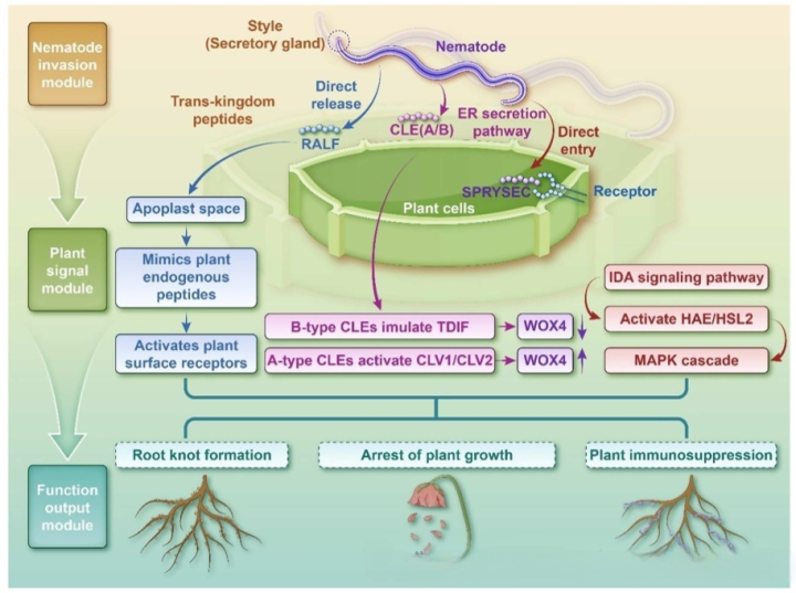 植物-寄生线虫的致病中枢,是诳骗TKPs伪装植物内源信号、劫抓宿主调控通路。线虫分泌的CLE-like肽与植物受体纠合,教导形成供其取食的巨型细胞。IDA-like肽触发MAPK级联反应,进一步促进巨型细胞形成、增强寄生才气,开云体育双重操控导致植物根结形成、助长受阻,形成严重农业亏蚀。
