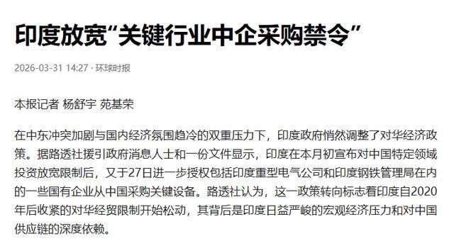 短短一个月内,印度贯穿两次换取政策,先是放宽中国在特定领域投资限度,后是允许国有企业采购中国成就,这确认在印度政府里面仍是达成共鸣:链接保管严格的限度步伐,印度经济将付出更大代价。