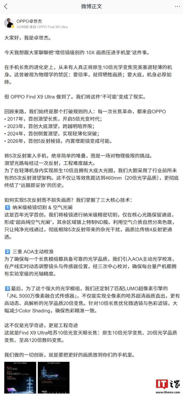 IT之家3月24日讯息,OPPOFind系列居品精致东说念主卓世杰发文谈及了“增倍镜级别的10X画质压进手机里”这一话题。他默示,在手机长焦进化史上,从未有东说念主真确将原生10倍光学变焦完整塞进冒失的机身:要倍率,就得就义画质;要大底,机身必厚如砖。