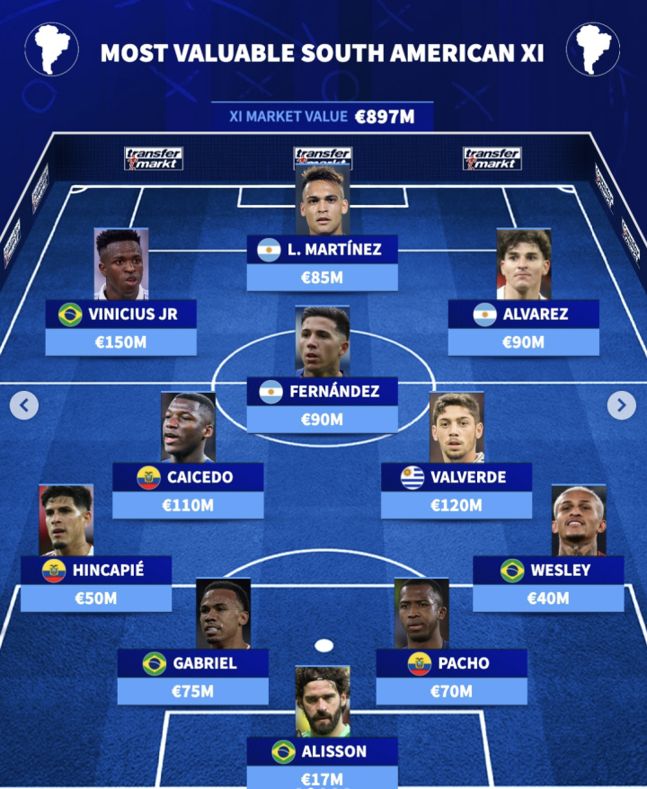 开云体育(中国)官方网站 南好意思洲球员最高身价声威: 维尼修斯1.5亿领衔8.97亿豪阵