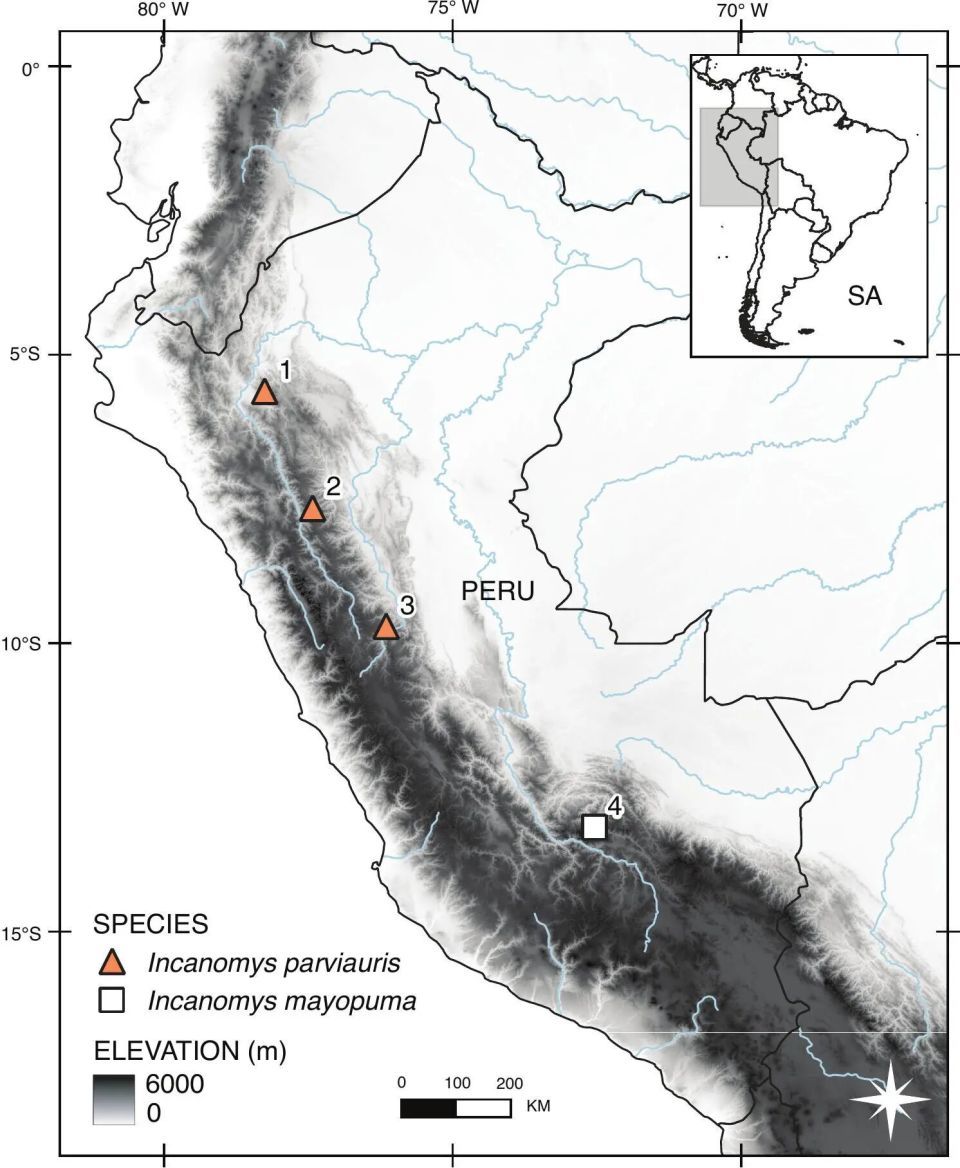 ▲上图:印加溪鼠属(Incanomys)物种辩认及网罗位点走漏图。图中三角形标示了本次参谋新定名的物种——小耳印加溪鼠(Incanomys parviauris)的具体网罗位置;正方形则代表同属的另一物种马约印加溪鼠(Incanomys mayopuma)。论文出处:Sánchez-Vendizú P, Abreu E F, Pacheco V, et al. (2026)